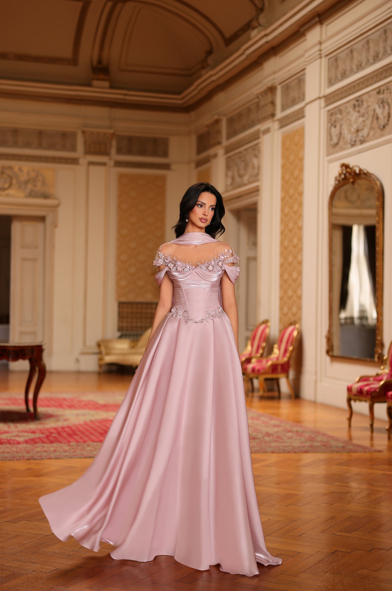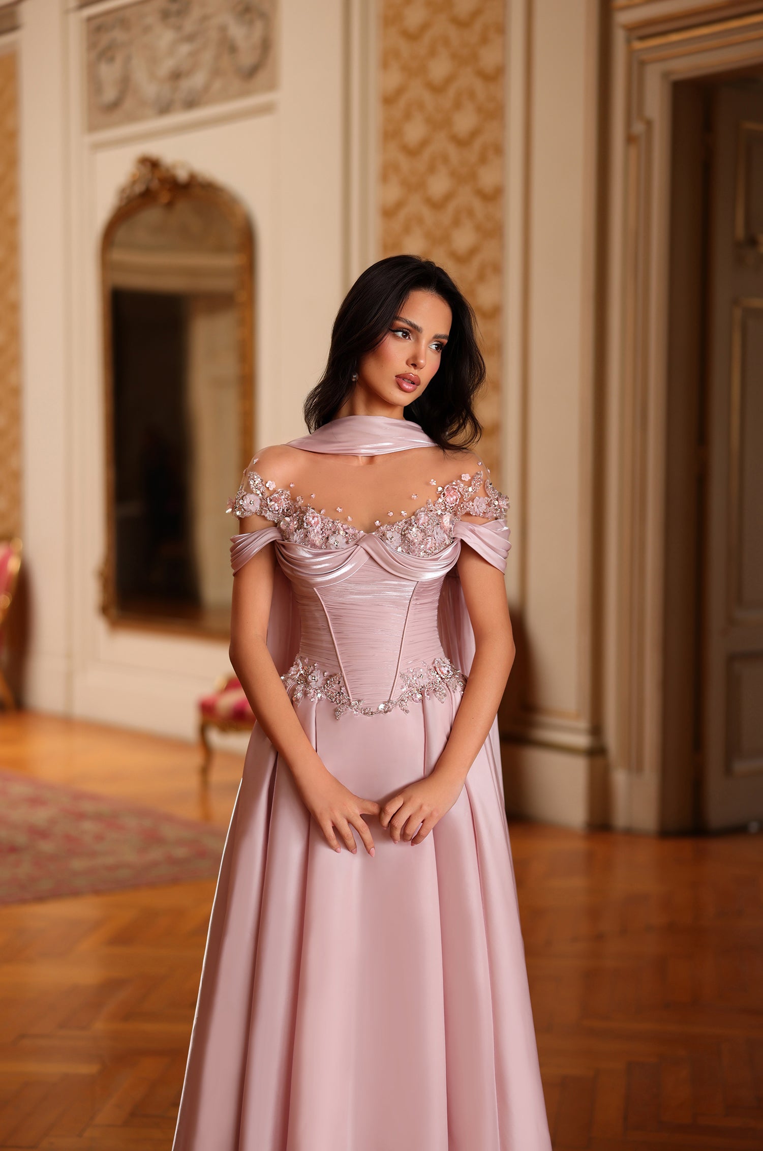 Step into pure elegance with the Aurora, a blush satin off-shoulder gown that radiates timeless sophistication.