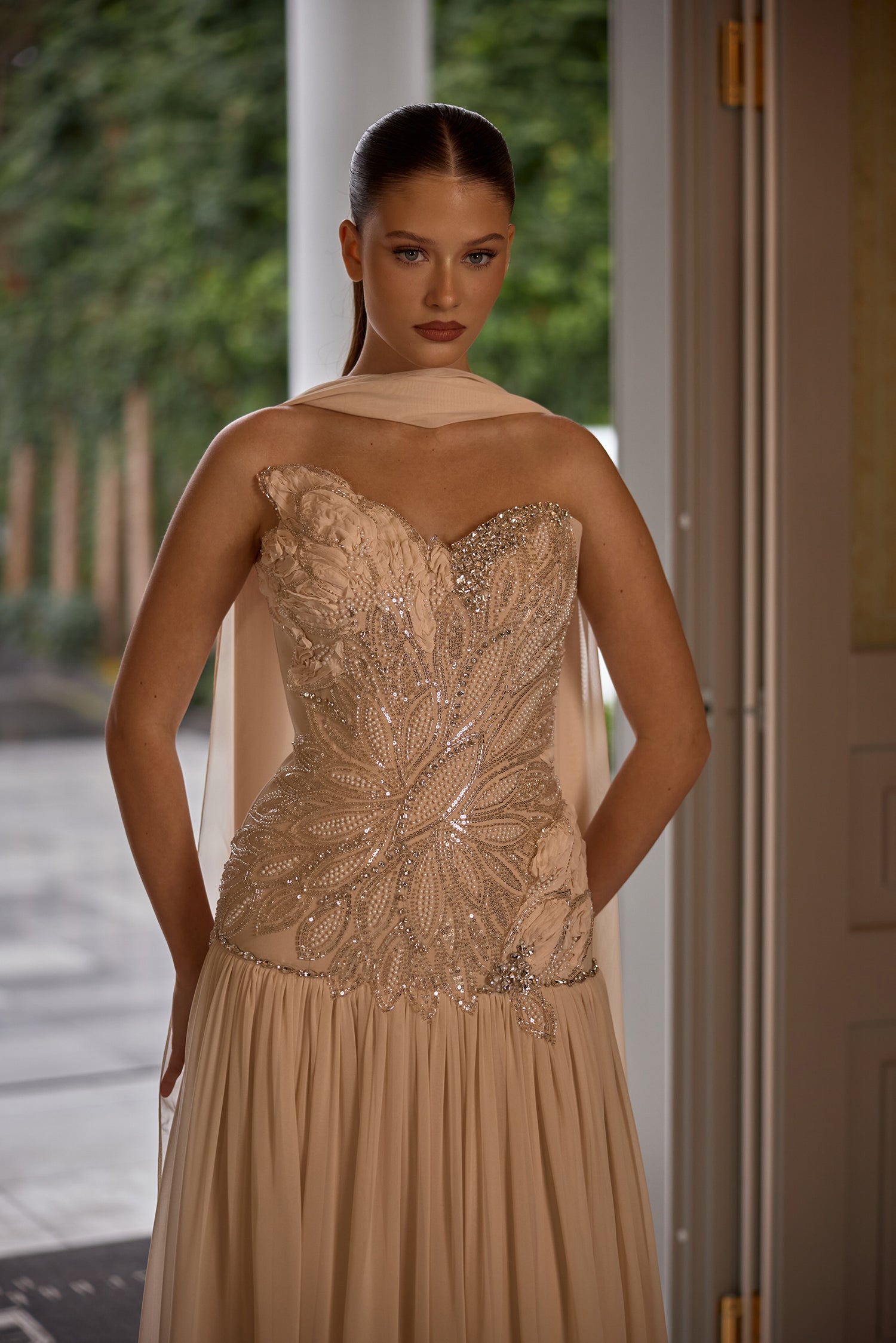 Presented in a luminous champagne beige tone, this gown features a sculpted strapless bodice adorned with intricate embroidery and shimmering embellishments that create a soft, radiant texture. The fitted upper silhouette gracefully transitions into a flowing skirt, allowing effortless movement and elegant fluidity.