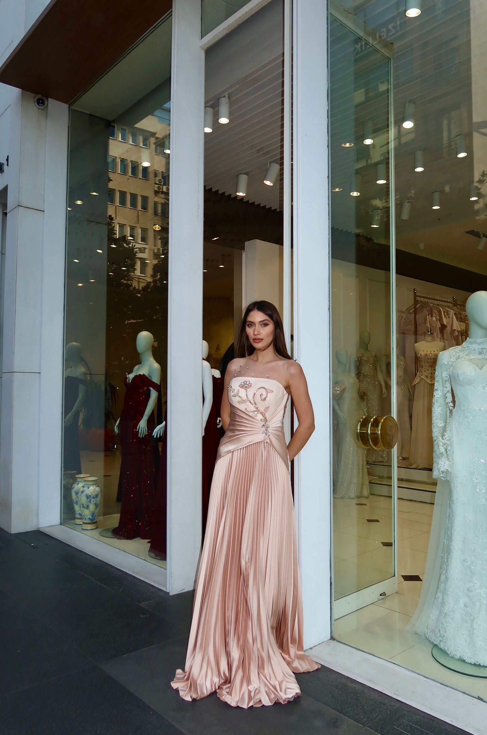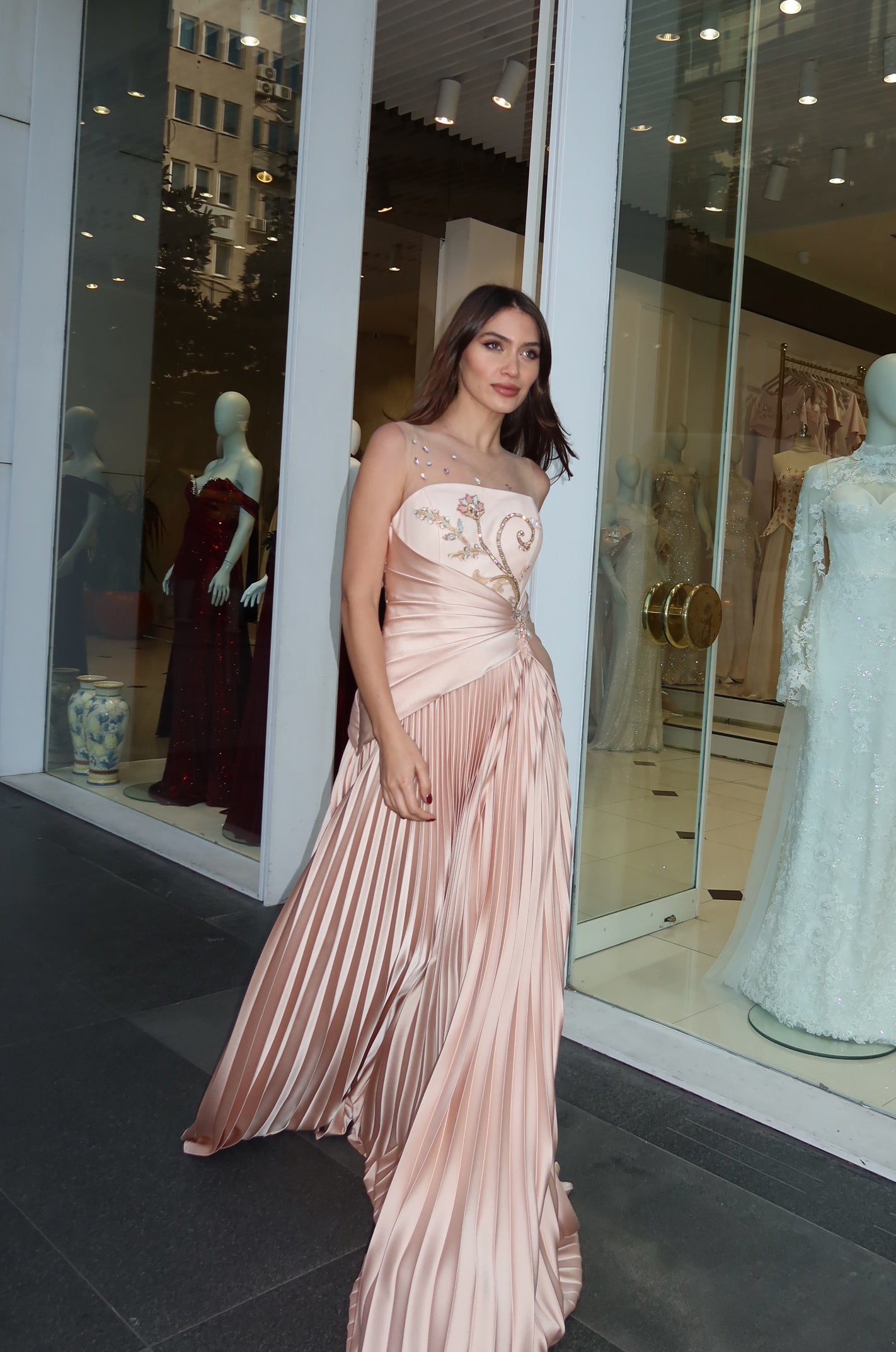 Crafted in a soft blush tone, this strapless evening gown features a delicately draped bodice adorned with refined embroidery and subtle crystal accents. The sculpted waist flows into a finely pleated skirt, creating a fluid silhouette that feels romantic yet sophisticated.