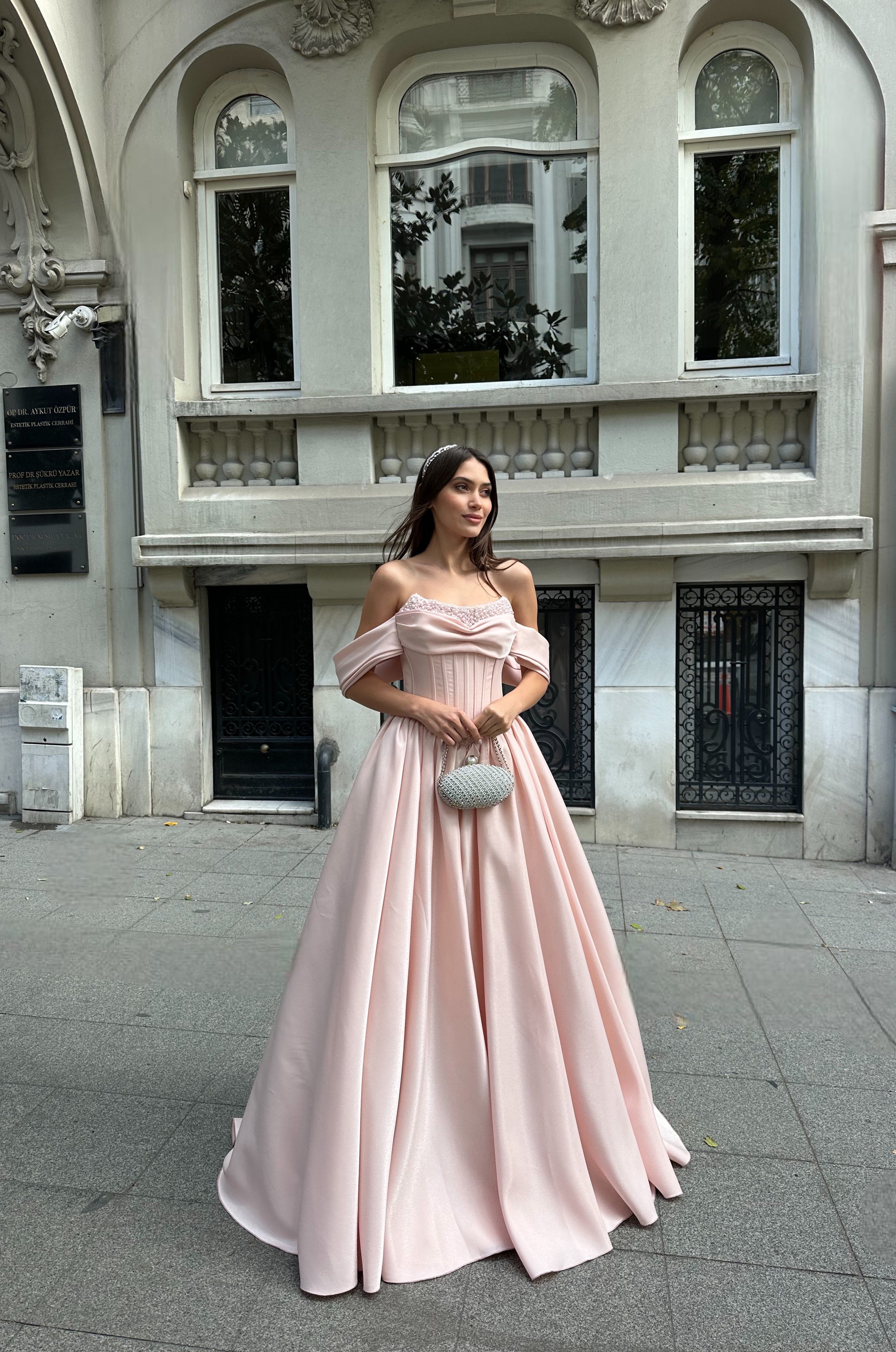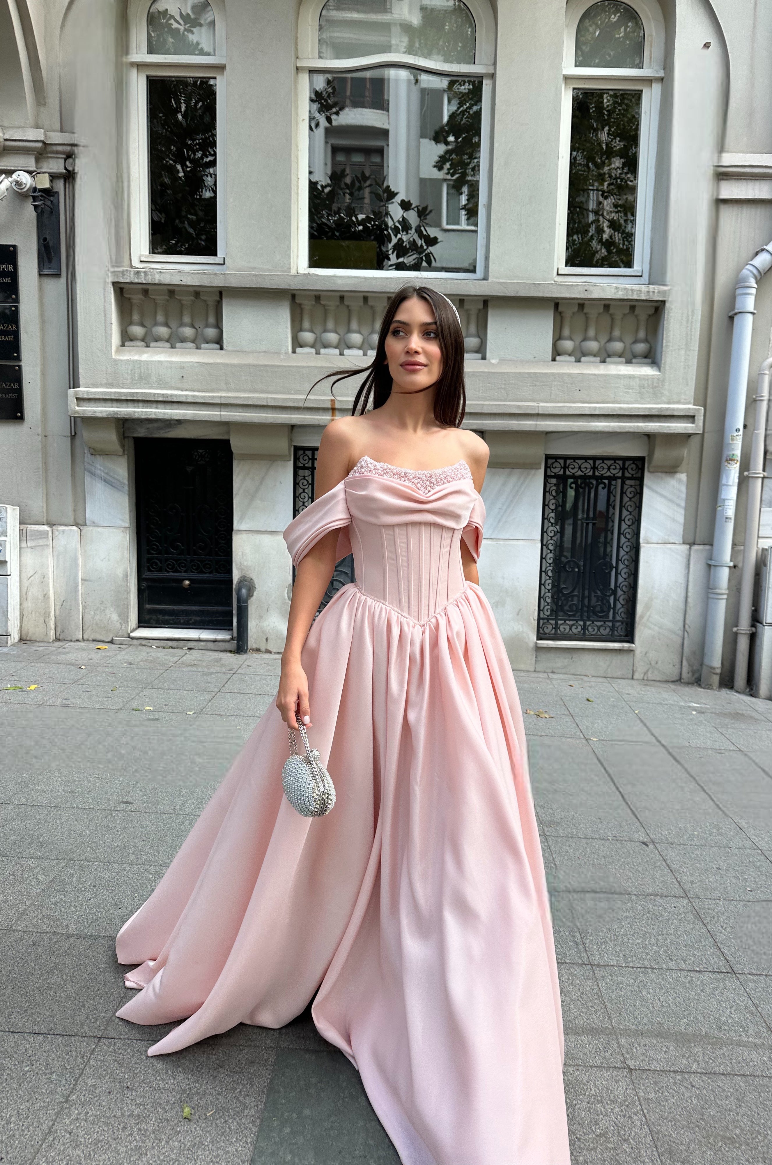 Featuring a sculpted corset bodice, this blush pink evening gown defines the waist beautifully while offering a refined, structured silhouette. The off-shoulder neckline gently frames the shoulders, adding a graceful and timeless touch. Delicate embellishment along the neckline enhances the couture feel without overpowering the design.