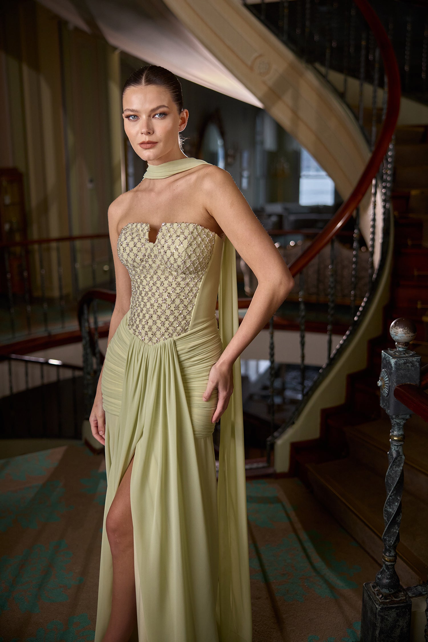 Designed in a soft pistachio green tone, this gown features a sculpted strapless bodice adorned with intricate crystal embellishments that create a luminous, textured effect. The structured upper silhouette beautifully contrasts with the fluid draping of the skirt, enhancing the waist while offering graceful movement.